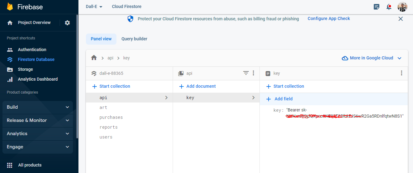 create new collection named **api.** inside that collection, create new document called **key,** then add new field in that document, call it **key** and give it a value like this: